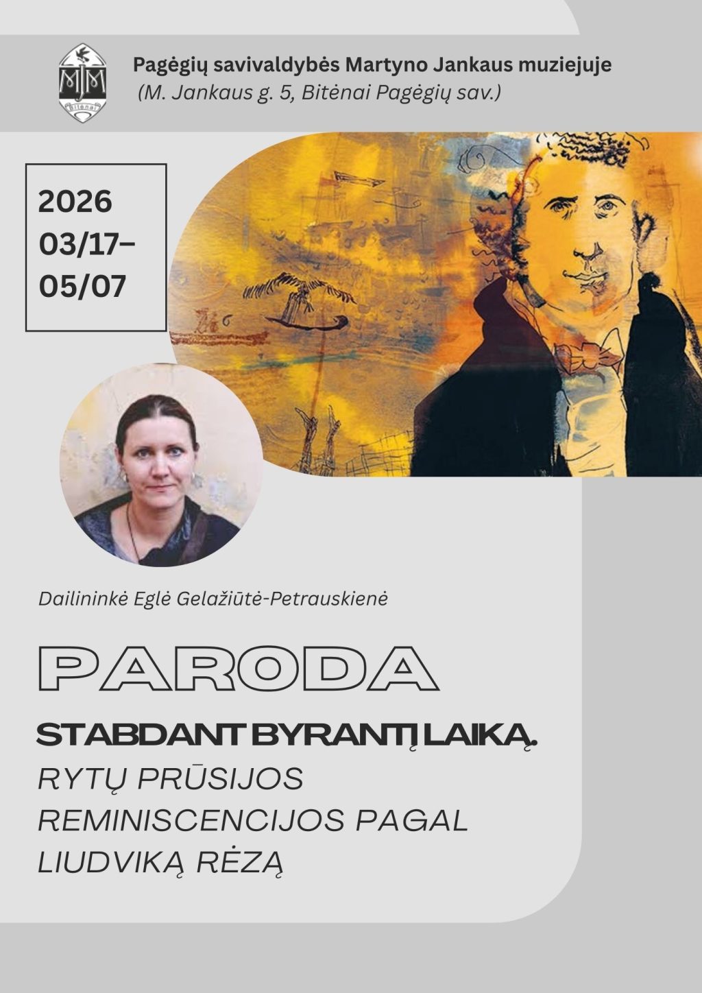 Nuo 2026 m. kovo 16 d. iki gegužės 7 d. Pagėgių savivaldybės Martyno Jankaus muziejuje (M. Jankaus g. 5, Bitėnai, Pagėgių sav.) eksponuojama dailininkės Eglės Gelažiūtės-Petrauskienės paroda